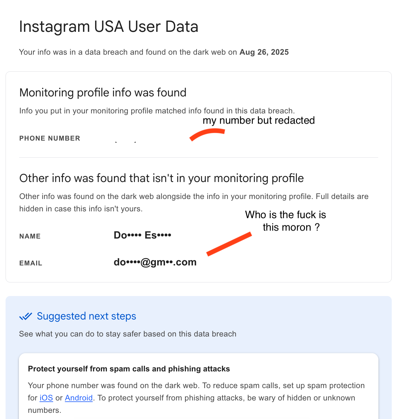 arrow-up110imageWhen Google tells you that someone is using your phone number on Instagram but they refuse to tell you their username or their gmail account that Google knows to protect the scammer's privacy.reddthat.comTheReturnOfPEB@reddthat.comM · 3 days agomessage-square1linkfedilink